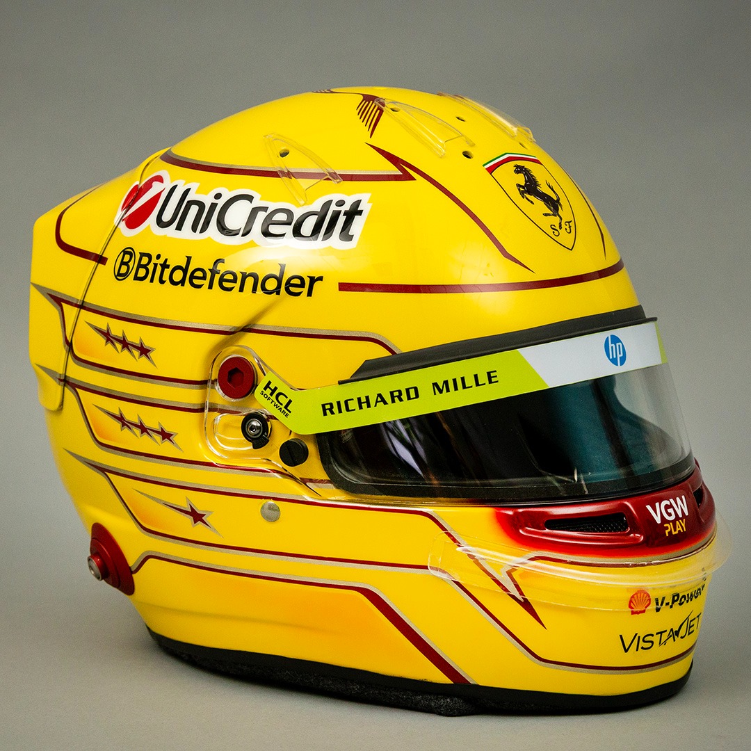 Pintura especial inspirada no capacete utilizado por Lewis Hamilton nos testes de pré-temporada da Ferrari em 2025